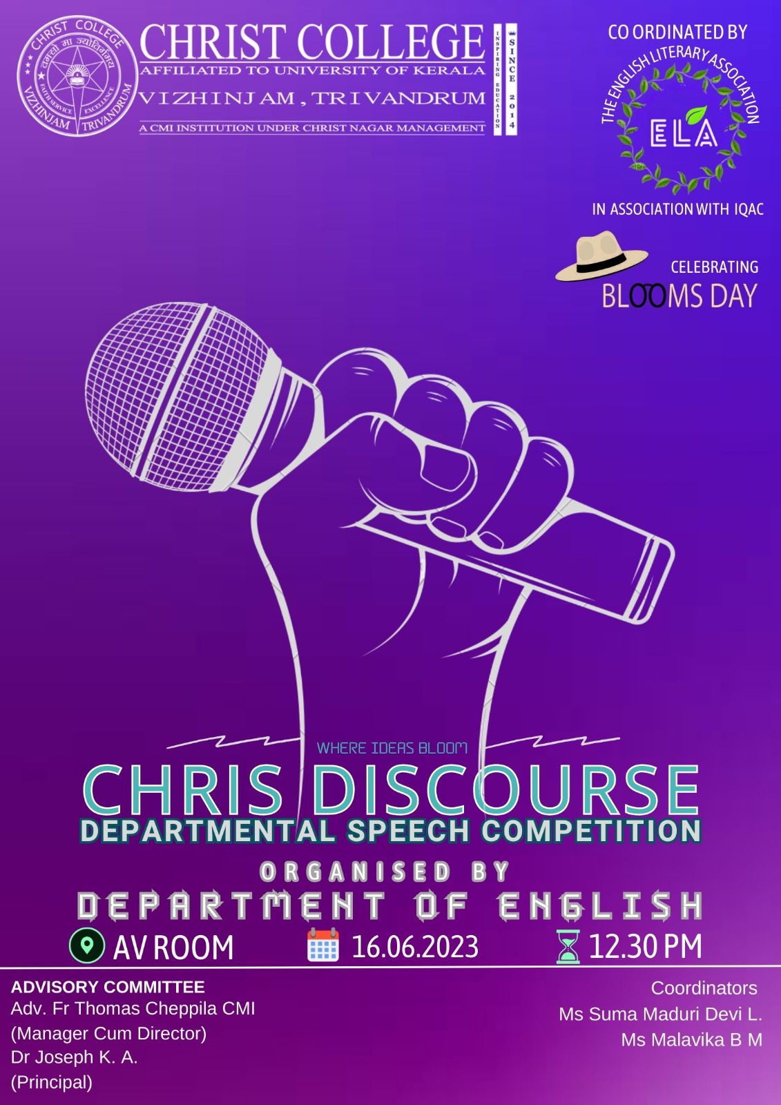 The Department of English and ELA’ 23 in association with IQAC, conducted a speech competition on Bloomsbury Writers in connection with Blooms Day on 16th
