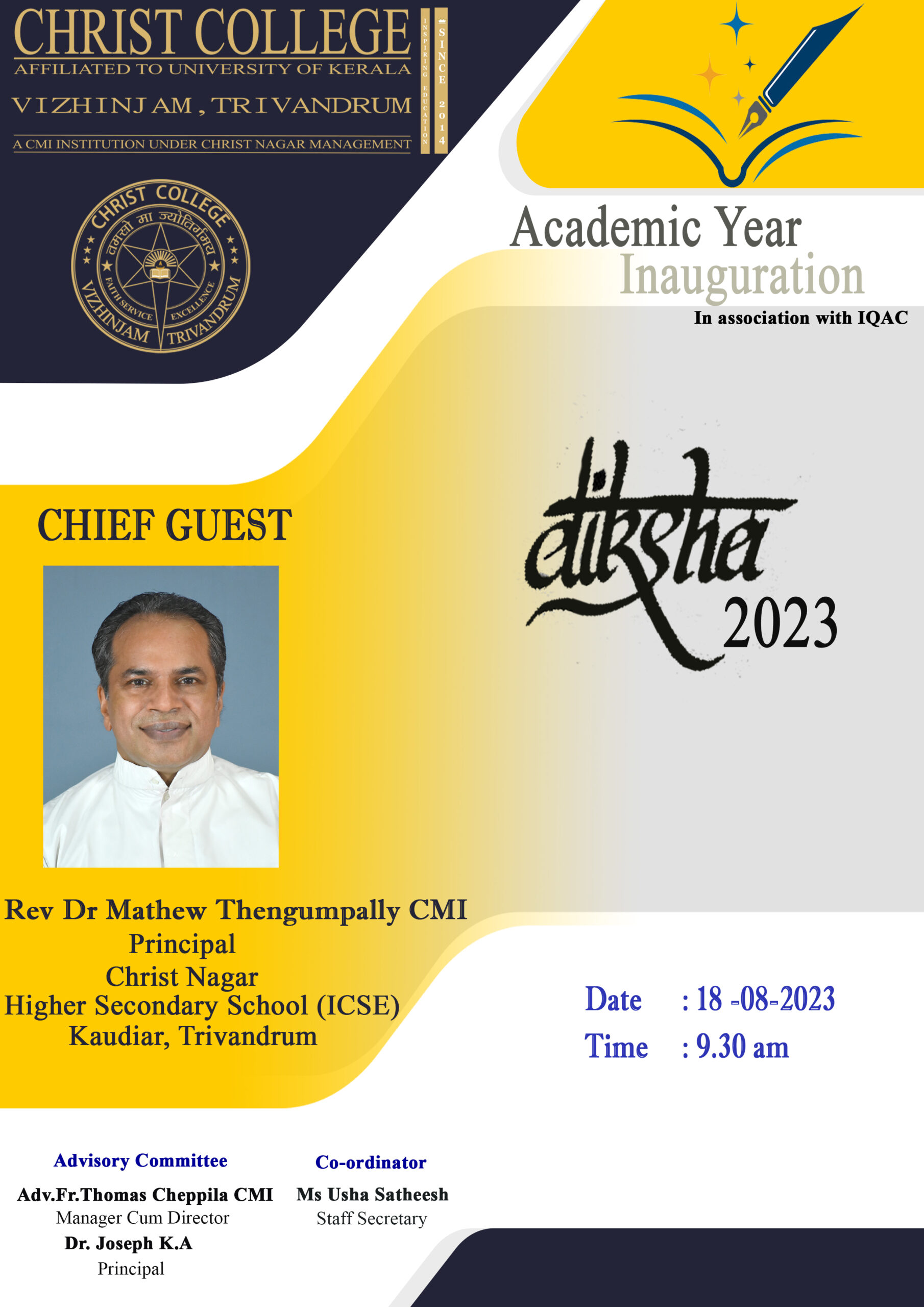 CHRIST COLLEGE CELEBRATED DIKSHA 2023 THE ACADEMIC INAUGURATION The word DIKSHA is derived from Sanskrit which means ‘Guru delivering wisdom to disciples’. It is also