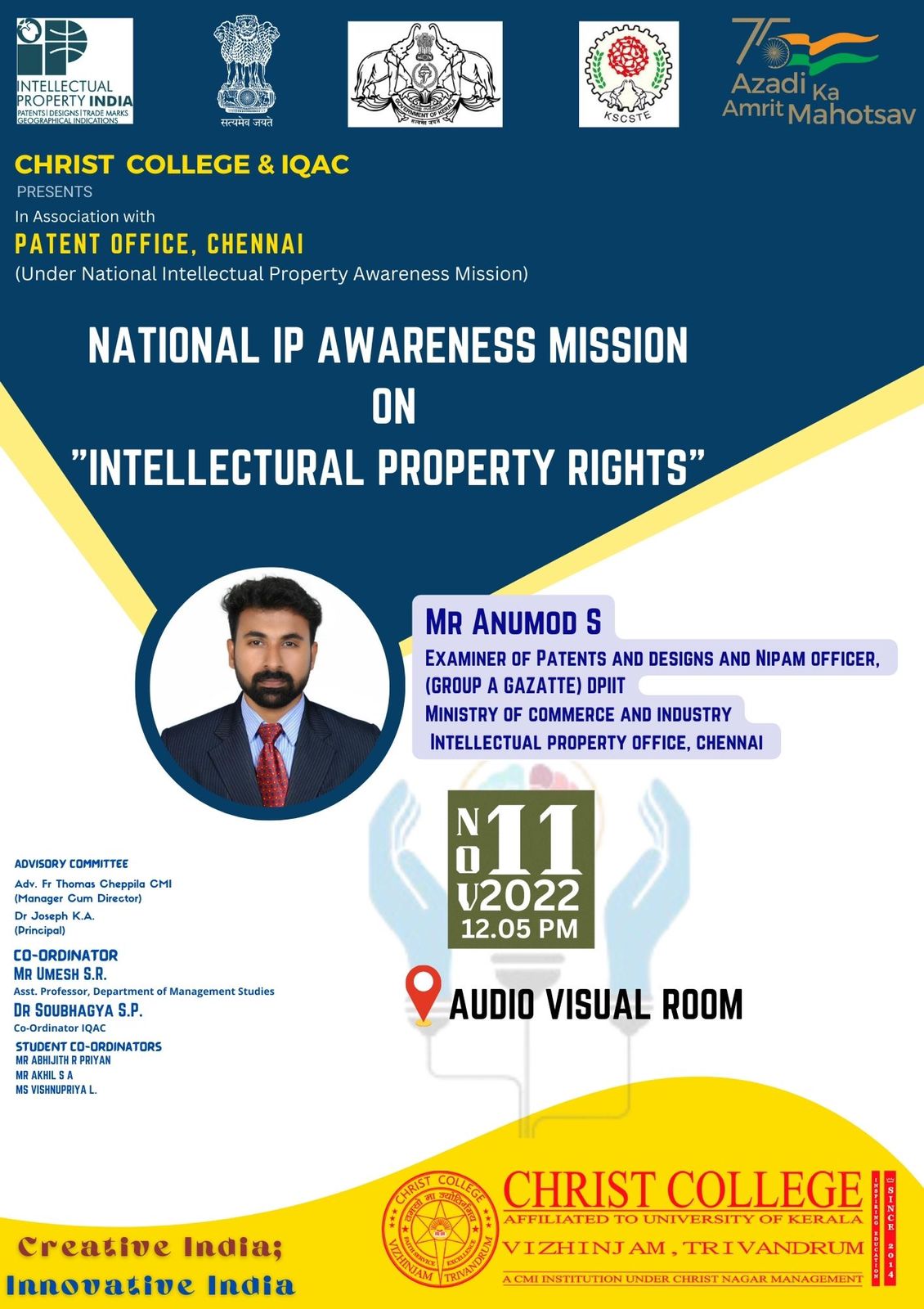 An awareness programme on Intellectual Property Rights is held on 11-11-2022 at 11.30 am in the Audio Visual Room and the chief guest of the