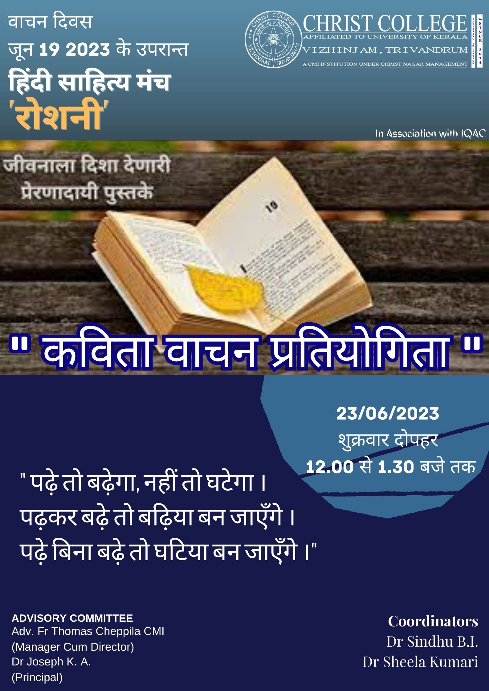 The Department of English and ELA’ 23 in association with IQAC conducted a reading competition on 19th June 2023 in connection with National Reading Day.