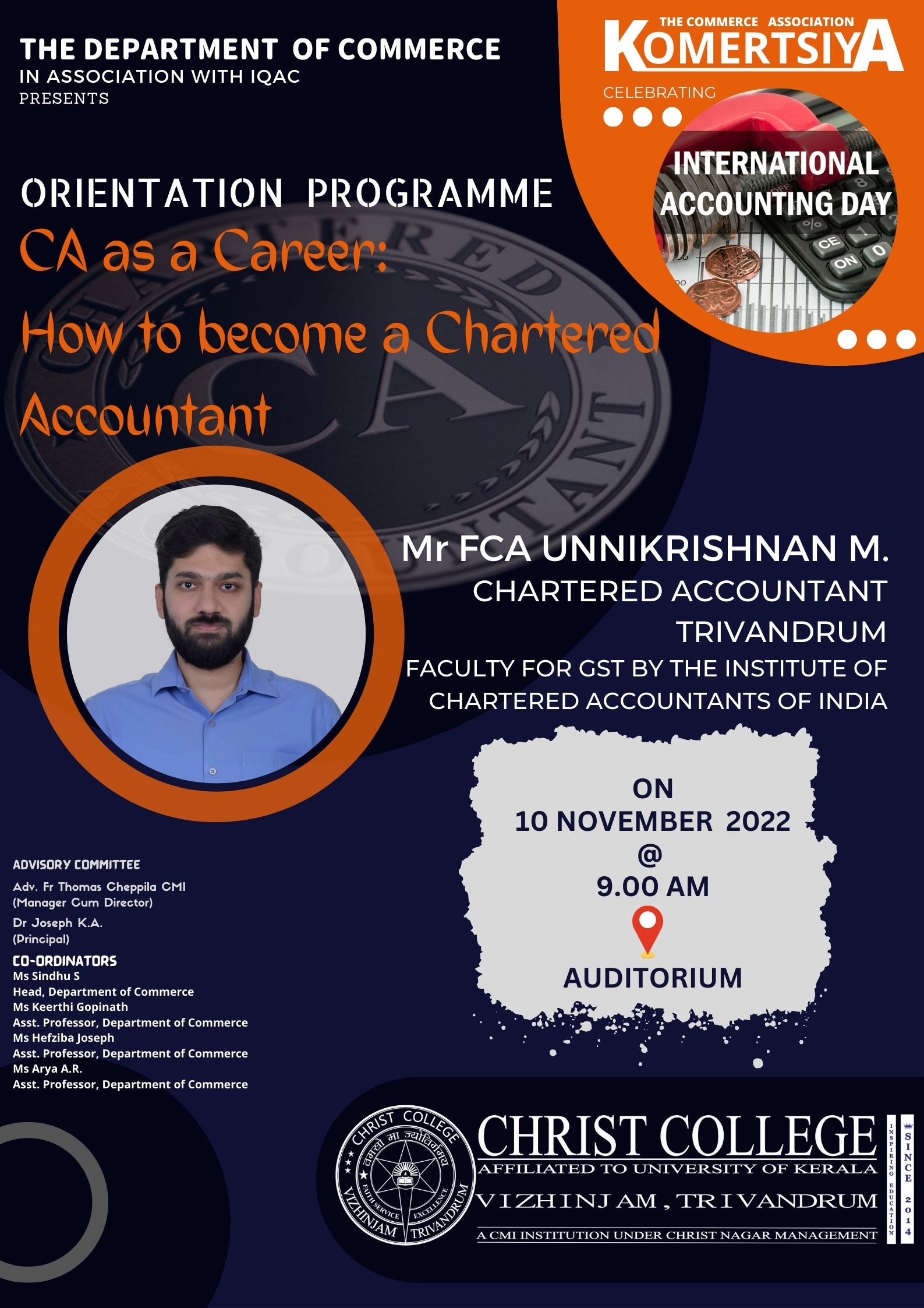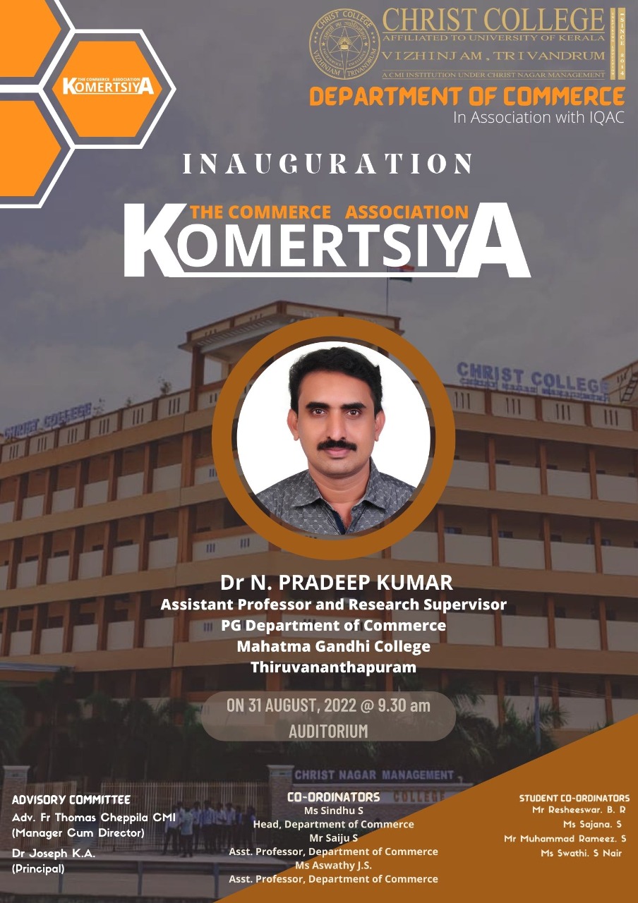 The inauguration of the Commerce association- ‘KOMERTSIYA’ of Christ College Vizhinjam held on 31st August, 2022 at College Auditorium conducted by Department of Commerce.The Commerce