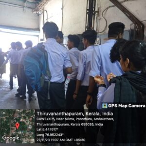 The Department of Management Studies organized an industrial visit to the Diary of Milma at Ambalathra as part of their academic activities. The study was conducted for the first semester BBA students. The students got to know the various operational departments of an organization and how the different production units function simultaneously. They also got to see the huge machinery, the flow of production from one unit to another, as well as the packaging of the products. 39 students and 2 faculty members visited the diary on the 27th of November 2023.