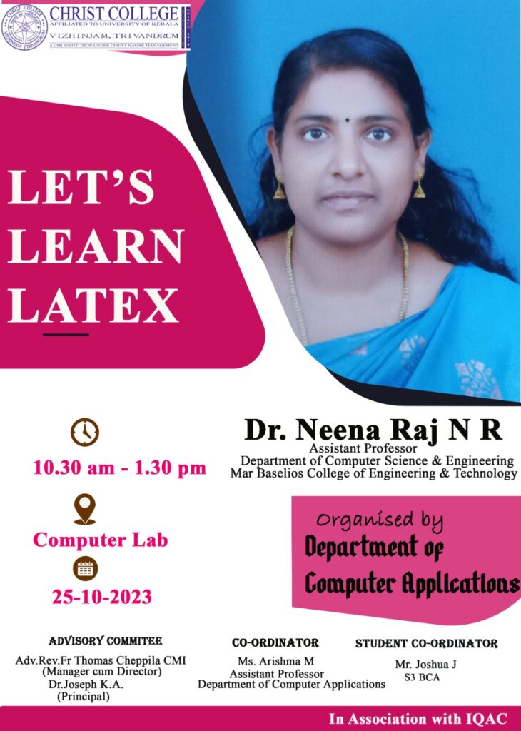 The “Let’s Learn LaTeX” workshop, organized by the Department of Computer Applications in association with the Internal Quality Assurance Cell (IQAC), was held on the 25th of October 2023, at the Computer Lab of Christ College, Vizhinjam. The workshop aimed to introduce students to LaTeX, a powerful typesetting system commonly used for academic and technical documents. Dr. Neena Raj N R, an Assistant Professor at Mar Baselios College of Engineering & Technology, served as the resource person for this event.