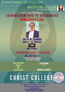 Medialogue, the Add-on Course on ‘Journalism and TV anchoring’, was inaugurated on 19th May 2021 at 3:30 P. M. via Google meet in the Department of English, Christ College Vizhinjam Trivandrum. The course was inaugurated by Mr P.P. James, Editor In-charge of 24 News Channel. The program started with a silent prayer and the welcome speech was done by Ms Soorya Nayana , HOD, Department of English, Christ College Vizhinjam. The Presidential address was done by Dr Cheriyan Panicker, Principal of Christ College Vizhinjam. The introductory session was handled by Mrs Gopika I. S., Former Senior Reporter, The New Indian Express, who spoke about the impact of media and technology. The objectives of the course were introduced along with the basic concepts and fundamental principles of anchoring; familiarized the students with the different styles of anchoring, news reading; exposed the wider application of mass communication and public speaking.