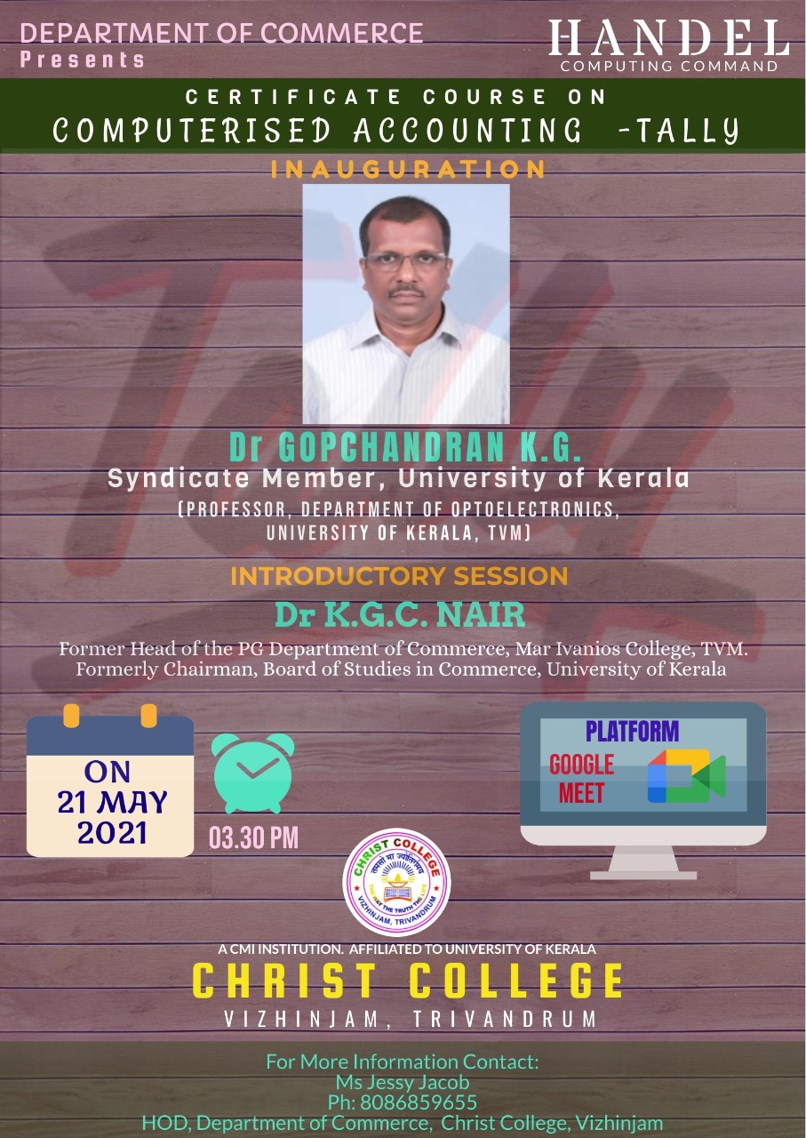 A Certificate Course on ‘Computerised Accounting – Tally’, was inaugurated on 25th May 2021 at 3:30 P. M. via Google meet in the Department of