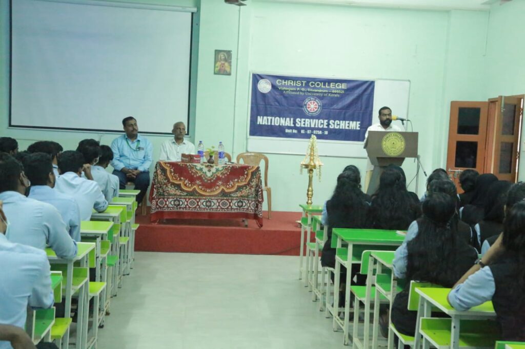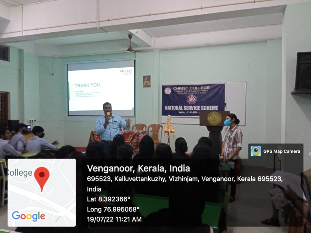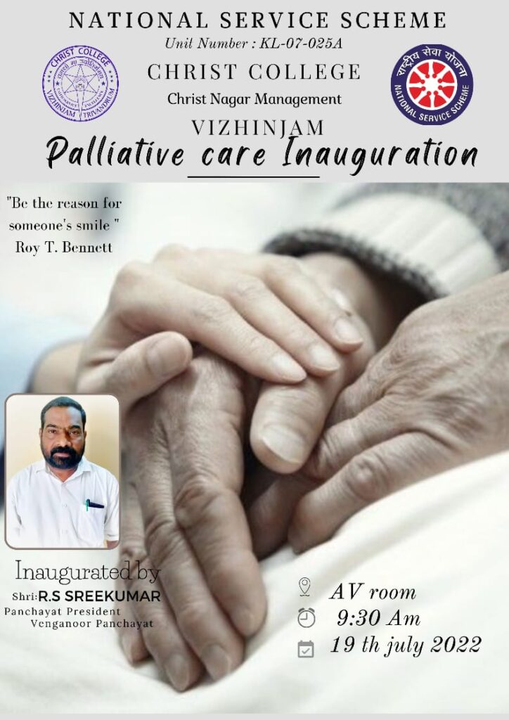 Christ College, Vizhinjam NSS Palliative care unit inauguration is done by Shri. R. S. Sreekumar, Panchayath President, Venganoor Panchayath. Following that an awareness class is given by team Pallium India. Mr Babu Abraham, (Department Head, Social Engagement), Ms Abhirami P. C (Community Social Officer) & Ms Rachel Chacho(Intern, Stella Maris College) led the session.