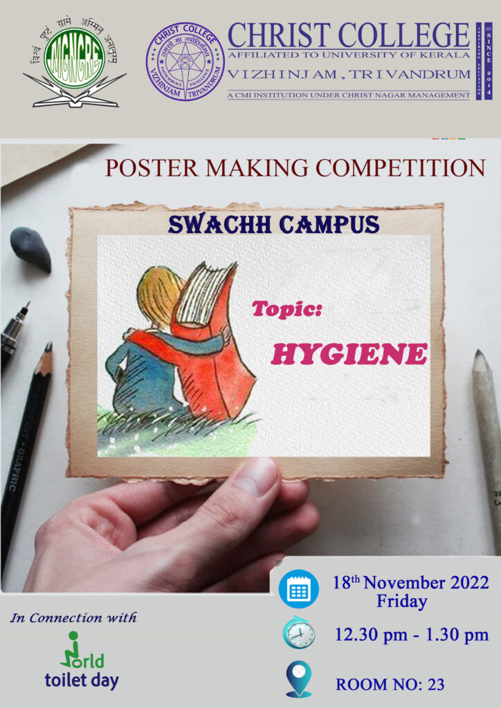On 18th of Friday, November 2022, students of Christ College Vizhinjam were given the opportunity to showcase their artistic talents under the initiative of Swachh Campus in association with World Toilet Day. The topic presented was “Hygiene”, where students can give wings to their imaginations and voice their worries of sanitization and cleanliness through the medium of artistic humor. Students from various degree programs showed active participation and immense interest in the competition. Many talents and ideas were sketched through the papers of young aspiring artists. Participants were given the time limit of one hour to brainstorm their work and make it worth it.
