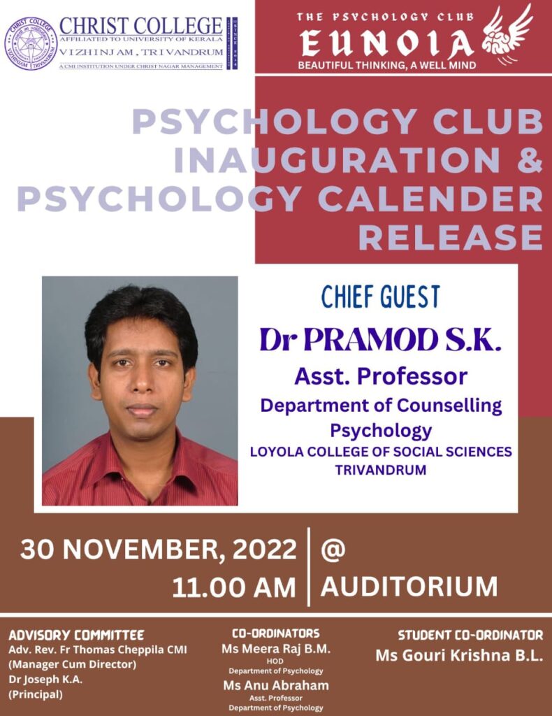 30th of November, 2022 would indeed go down as an auspicious experience for the budding Psychologists of Christ College, Vizhinjam. Students belonging to the first batch of Psychology had the honor to join in for the inauguration of our Psychology Club, Eunoia.Blessed by the beloved presence of Chief Guest Dr. Pramod S.K, Asst. Professor from Department Of Counselling Psychology of Loyola College Of Social Sciences along with Dr. Joseph K.A, Principal and co-ordinators Mrs. Meera Raj B.M, HOD of Psychology and Mrs. Anu Abraham, Asst professor, Department Of Psychology, the ceremony took of with flying colors. Inauguration of the club was followed by Psychological Calendar release, where the students of Psychology Department proudly showcased their artistic skills and portrayed the historical events prominent in the field.
