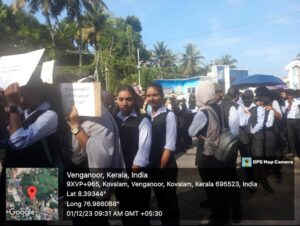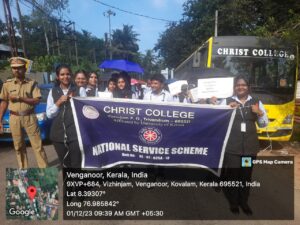 On the occasion of World Aids Day, 2023, observed annually on December 1st, a rally was organized by the NSS unit of Christ College, Vizhinjam in association with the Venganoor Grama Panchayath and the Community Health Centre, Vizhinjam. The rally started at 9:00 am. All the NSS volunteers from Semester 1 and 3 who participated in the event reached Azhakulam from the college on time. The rally was from Azhakulam to Vizhinjam. The participants carried a red ribbon during the rally. The coordinators really helped and the volunteers brought pluck cards with awareness slogans to spread the awareness to the mass.
